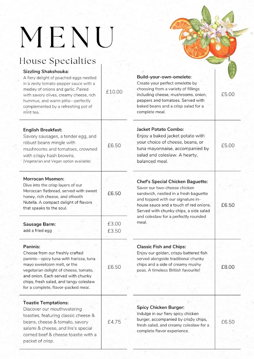 House Specialties include traditional breakfast and substantial light meal options. Key items include the English Breakfast, Sizzling Shakshouka, Moroccan Msemen, Sausage Barm, and a Build Your Own Omelette. Additionally, there are light meal choices like Jacket Potato Combo, Chef’s Special Chicken Baguette, Classic Fish and Chips, and a Spicy Chicken Burger.
