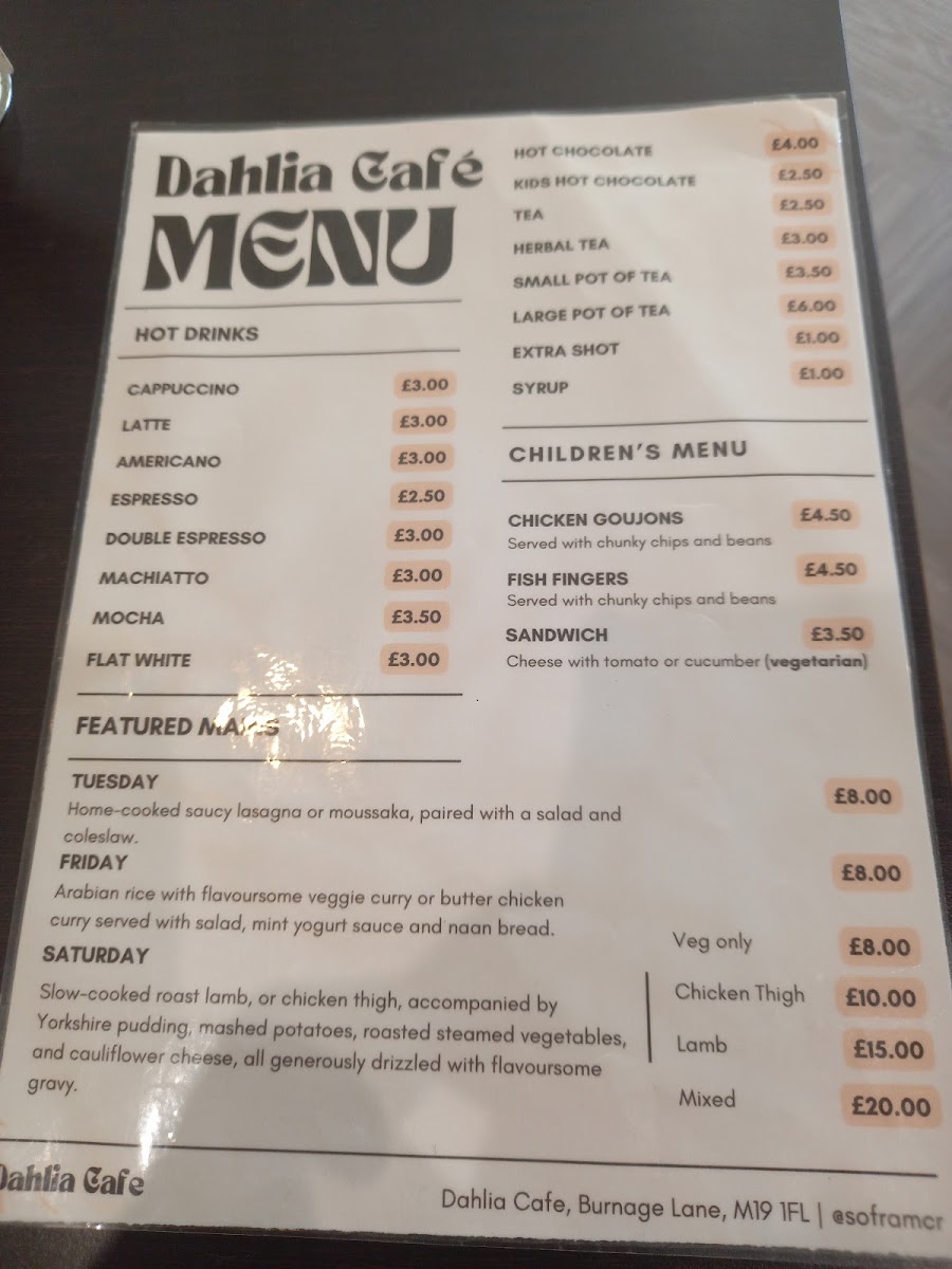 The menu at Dahlia Café offers a variety of options suitable for breakfast, brunch, and light lunches. It is structured into several groups to cater to different preferences, including hot drinks, house specialties, and other beverages.